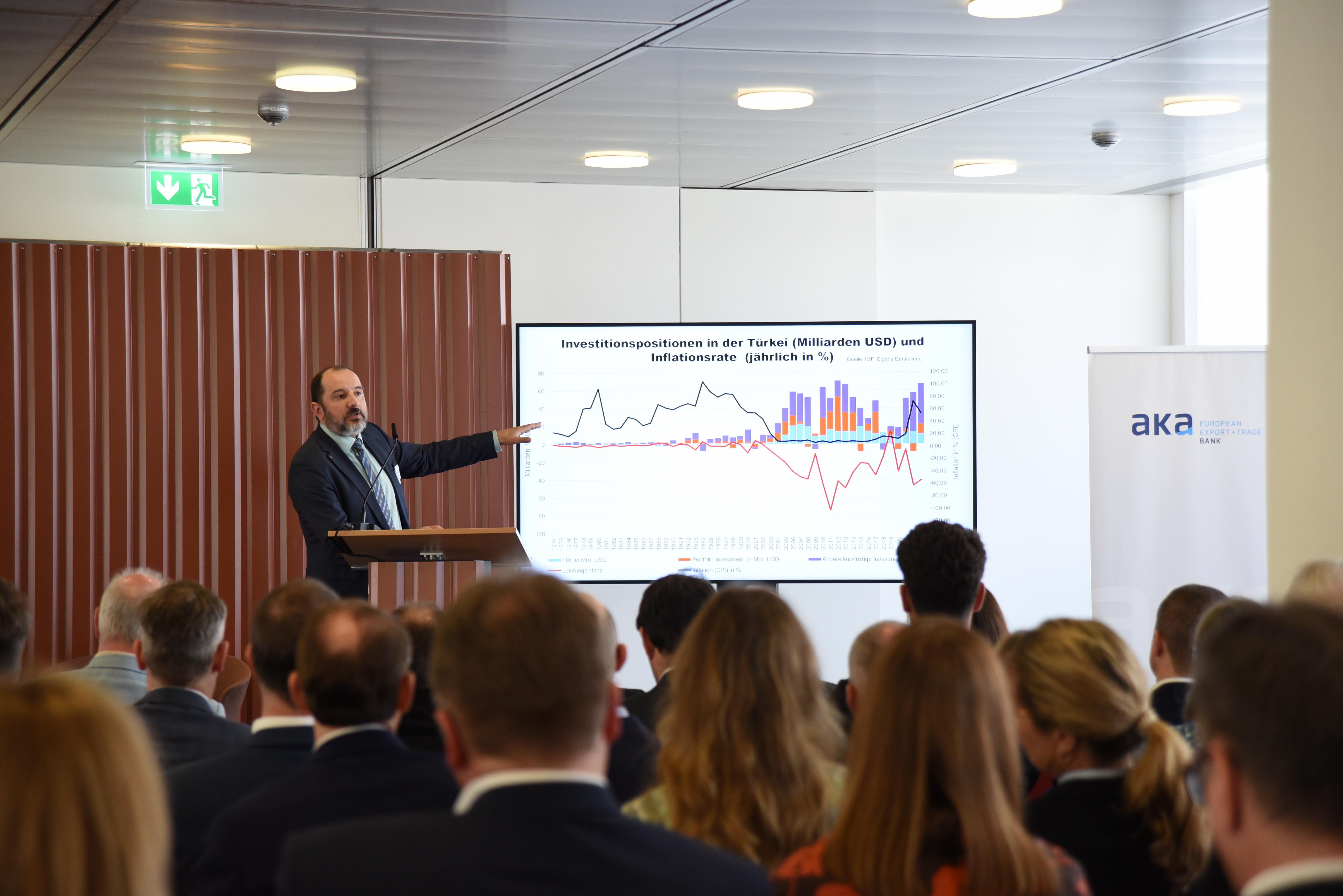 Professor Yalcin betonte das Exportwachstum der Türkei in die zentralafrikanischen Länder und die Ausbreitung der türkischen Industrie nach Jordanien und nach Zentralasien; risikobehaftete Regionen, in deren Märkte türkische Unternehmen eher eintreten. Daher sei die Türkei in Schwellenländern mit ähnlichen Strukturen gut positioniert.
